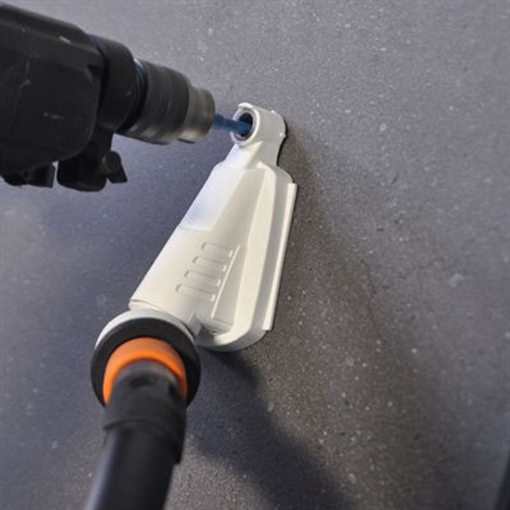 Punktutsugning av damm och vatten vid borrning. Används även som borrcentrerare. Flexibel led som underlättar anslutningen och användandet med dammsugarslang.