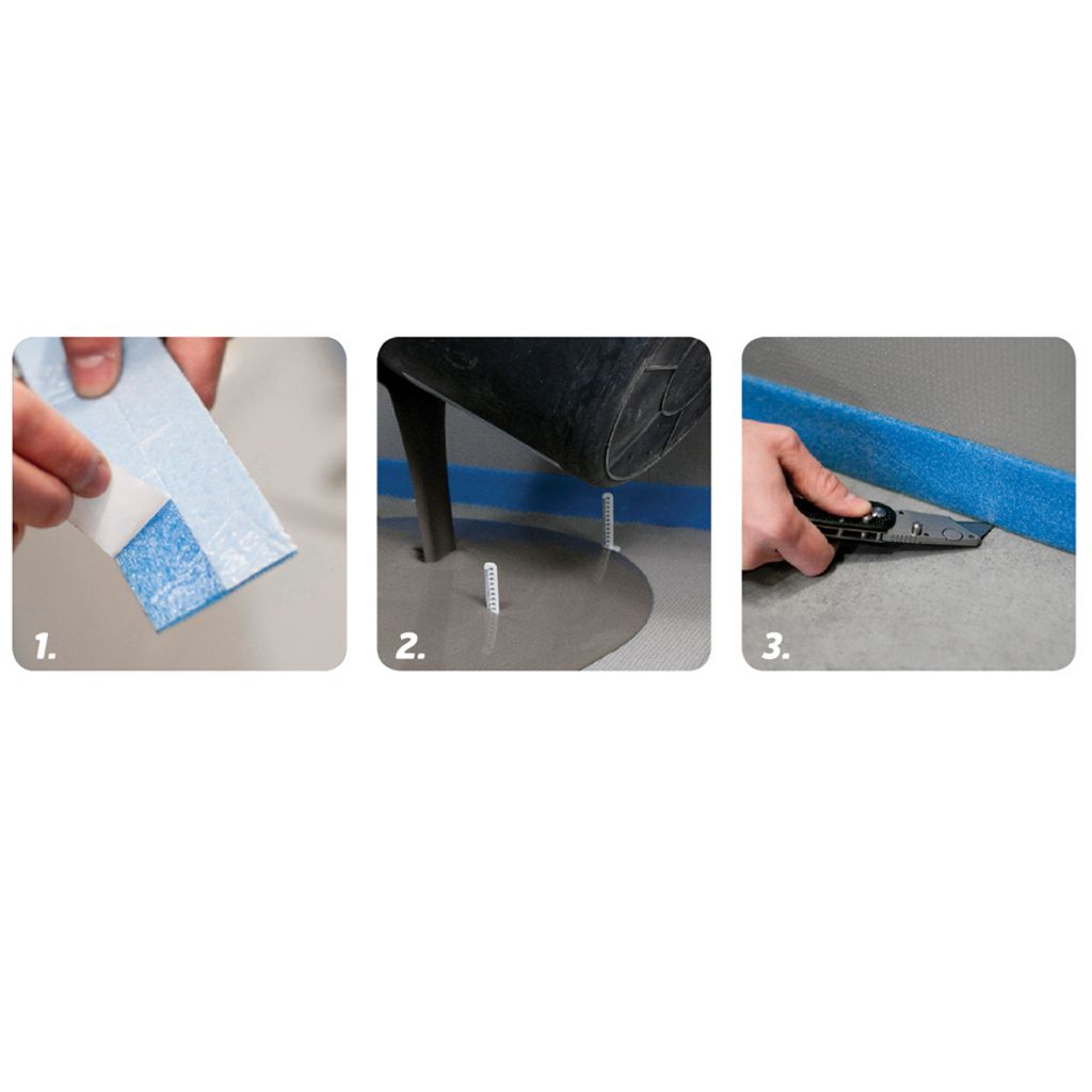 Självhäftande dämpfolie/kantband att användas vid flytande konstruktioner för att säkerställa att avjämningsmassan inte kommer i kontakt med omgivande byggnadsdelar.