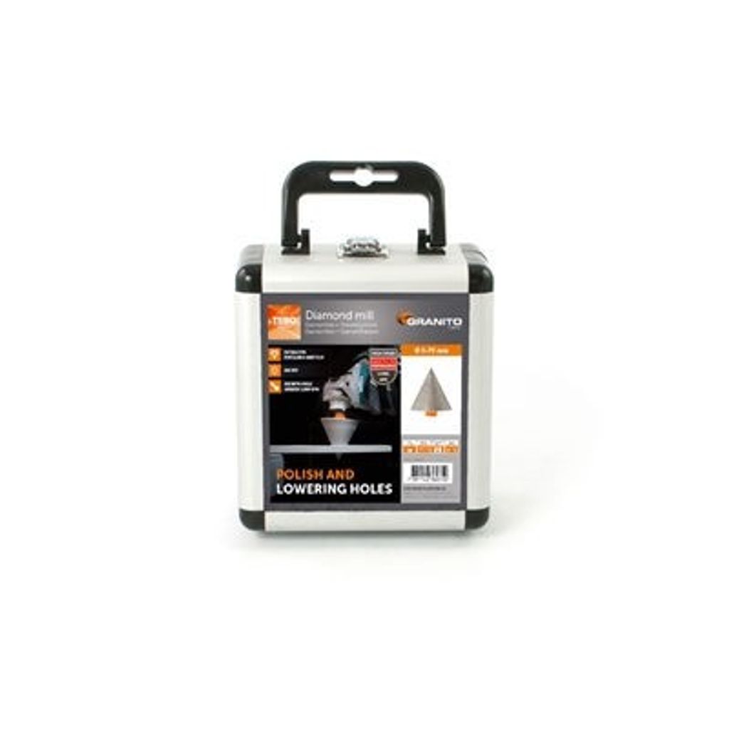 Tebo Diamantfräs konisk Granito Dry, För att förstora, försänka eller jämna till efter håltagning i klinker och granitkeramik. Motverkar spänningar och sprickbildning efter borrning. Underlättar vid montering av manschetter. Används utan vatten.