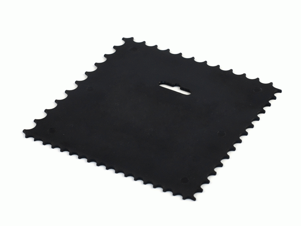 4-sidig fixkam av plast. 150 x 150 mm med rundad tandning i olika storlekar. Lämplig för mindre arbete. Val av tandningsstorlek på fixkam beror på plattornas storlek. Vid större plattor bör en fixkam med större tandning användas.