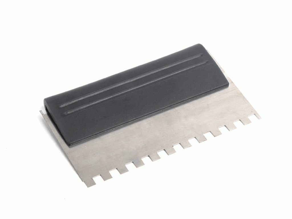 2-sidig fixkam med plasthandtag. 110 x 180 mm vändbart stålblad med fyrkantig tandning i olika storlekar. För t.ex sättning av byggkeramiska plattor med storlekar 10 x 10 cm till 30 x 30 cm.