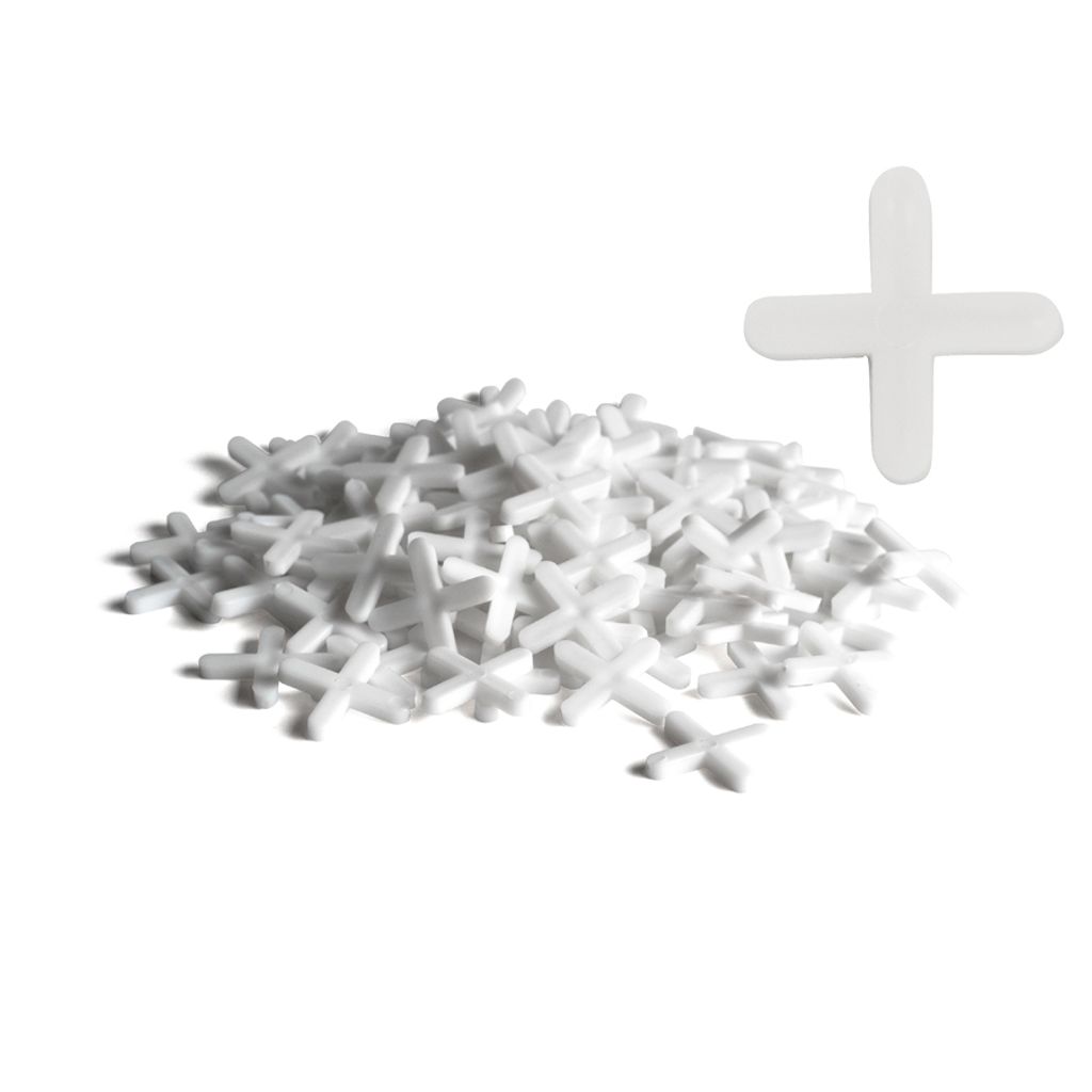5mm Kakelkryss av plast för jämn fogbredd vid plattsättning. Modell med korta ben och rund kant. Kan sitta kvar när fixet har stelnat då de täcks av fogen.