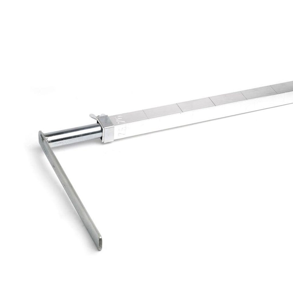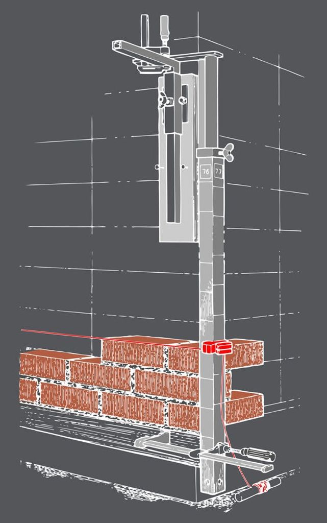 Tebo murarkäpp tillverkad i aluminium med instansade skifthöjder. Ger fäste åt murarklossen. Används för att sätta ut skifthöjden vid murning.