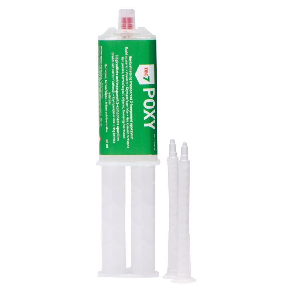 Tec7 Epoxylim Poxy är ett 2-komponents epoxilim med extremt stark limeffekt. Det är snabbhärdande, vattentätt och transparent. Med sin dubbel doseringsspruta, erbjuder det en enkel applicering och blandning. Det har högt kemiskt och elektriskt motstånd, krymper inte och kan bearbetas på flera sätt efter härdning.