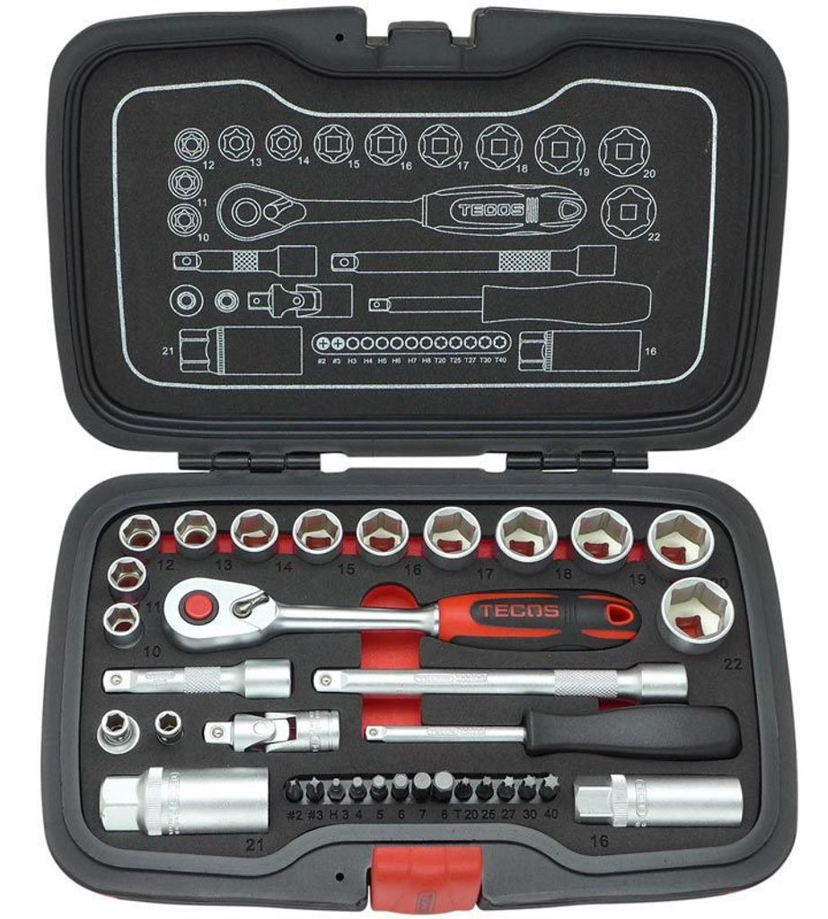 Tecos T-1934 är en 3/8" hylsnyckelsats med Flankdrive hylsor och bits. Totalt 34-delar i denna hylssats.