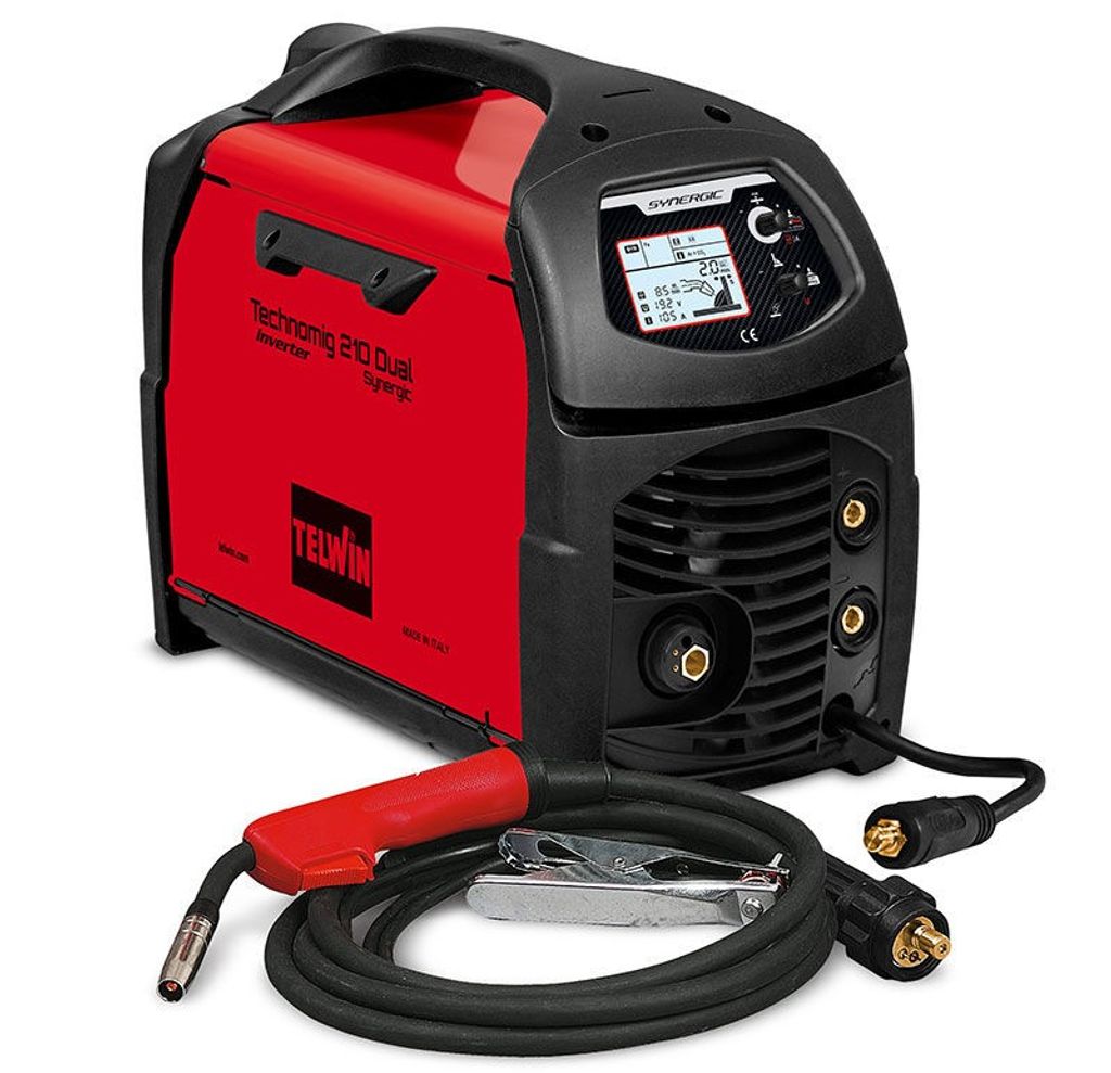 Telwin Technomig 210 Dual Synerrgic är en 1-fas Microprocessorstyrd inverter för Mig/Mag/MMA/Tig svetsning. Kan användas med gas eller med flusstråd. Den perfekta lösningen för ett brett område av tillämpningar, från underhåll till installation och plåtverkstäder.