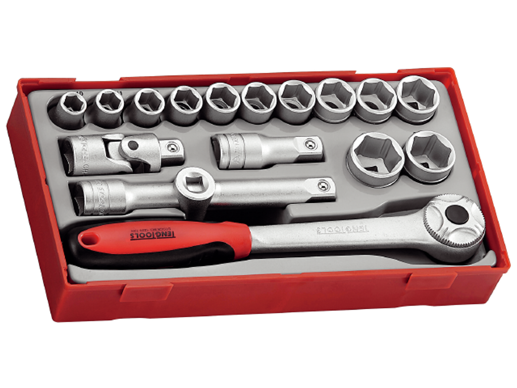 Teng Tools Sats innehållande 12 hylsor med tolvkant eller sexkant gripöppning. Dessutom ingår spärrhandtag med omställningsspak för vänster och högerdragning, förlängningsstänger 62 och 150 mm, förstoringstapp 3/8"- 1/2" samt universalknut.