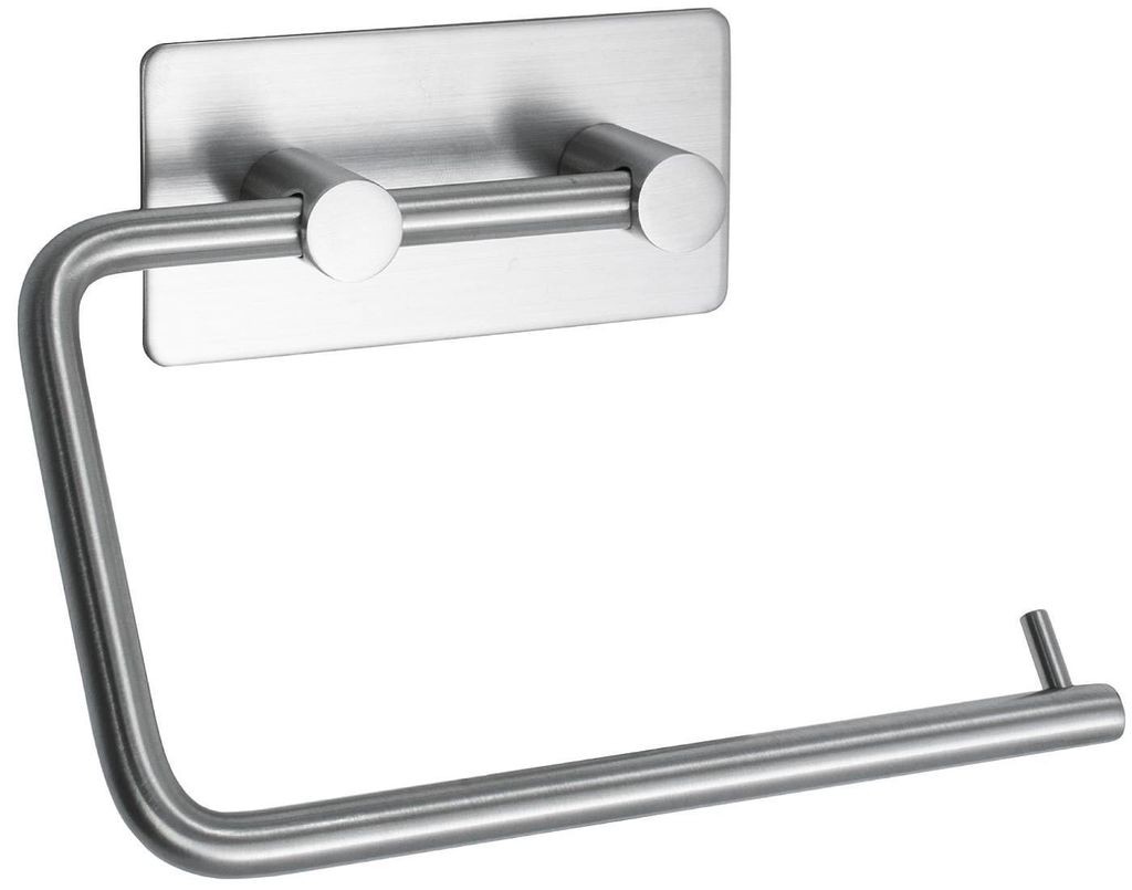 Toalettpappershållare tillverkad helt i mattborstat rostfritt stål med självhäftande baksida.