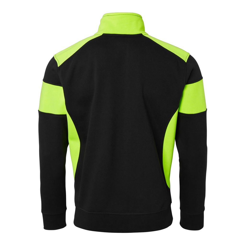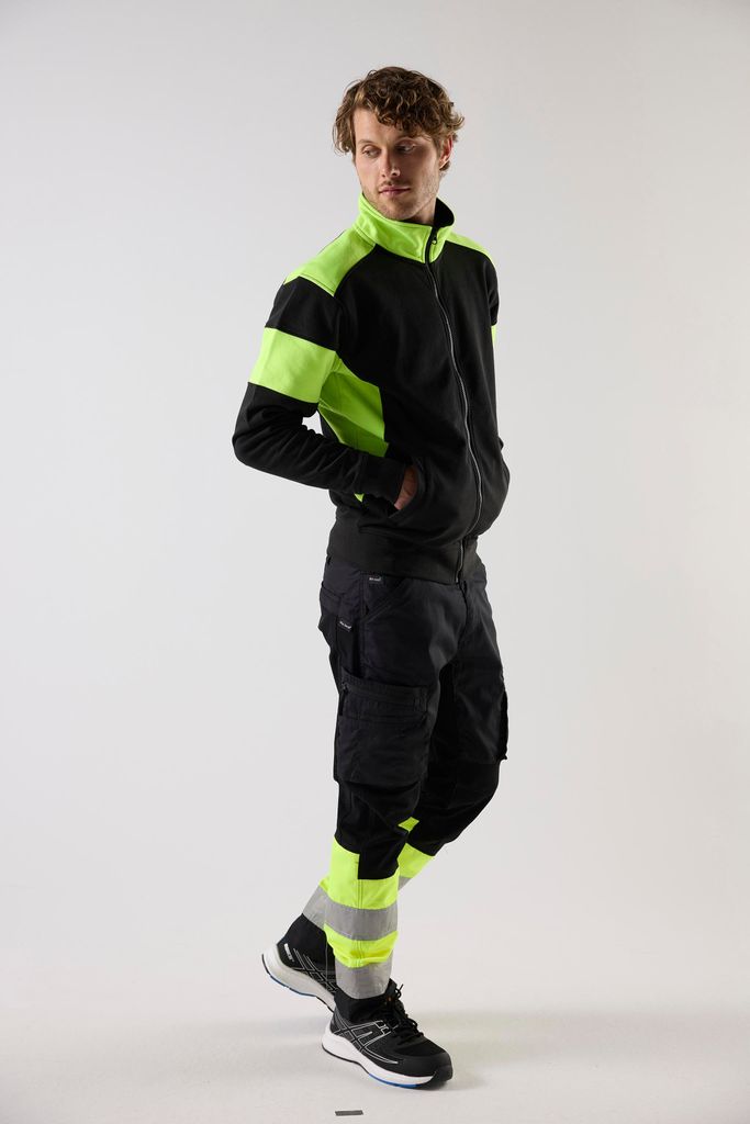 Top Swede 223 kombinerar bekväm sweatshirtkänsla med detaljer som gör skillnad på arbetsplatsen. Den höga synbarheten i svart gul design hjälper dig att sticka ut i miljöer där det rör sig fordon och människor, samtidigt som plagget behåller en ren och proffsig look. Hel dragkedja hela vägen upp i kragen gör att du snabbt reglerar värme och ventilation när tempot skiftar.
