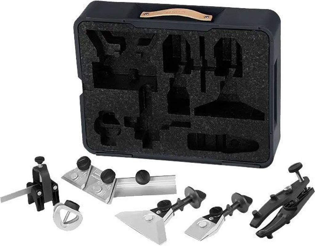 Tormek HTK-906 är ett komplett tillbehörspaket för slipning av vanliga handverktyg som knivar, saxar, yxor, gräsklipparblad och korta mejslar. Paketet innehåller sex viktiga jiggar och förvaras snyggt och prydligt i det tåliga Tormek TC-800-fodralet, vilket gör det enkelt att hålla ordning på dina slipverktyg.