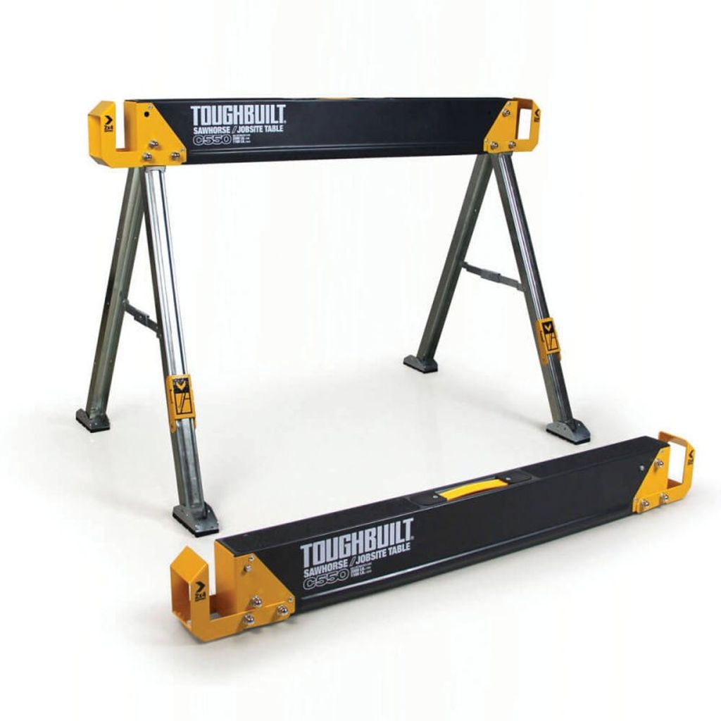 ToughBuilt C550 Sawhorse och Jobsite Bord är en robust och mångsidig lösning för arbetsplatser, kombinerar 100% stålkonstruktion med innovativa funktioner som 2x4 stödarmar och materialstödspinnar, erbjuder en kapacitet på 2200 lb per par.