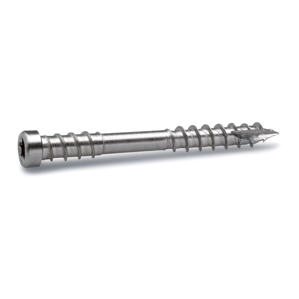 Trallskruv avsedd främst för användning i hårda träslag. Dubbel gänga som dels gör det möjligt för skallen att försänkas i hårda träslag och dels håller virket på plats med hjälp av gängorna och inte med skallen. Den cylinderformade skallen skär rakt ner i träet och ger ett utmärkt resultat. Fungerar även ypperligt i tryckimpregnerat virke. Försedd med fiberskärande borrspets. I hårda träslag krävs förborrning. Material: Syrafast stål A4 (AISI316). Burk.