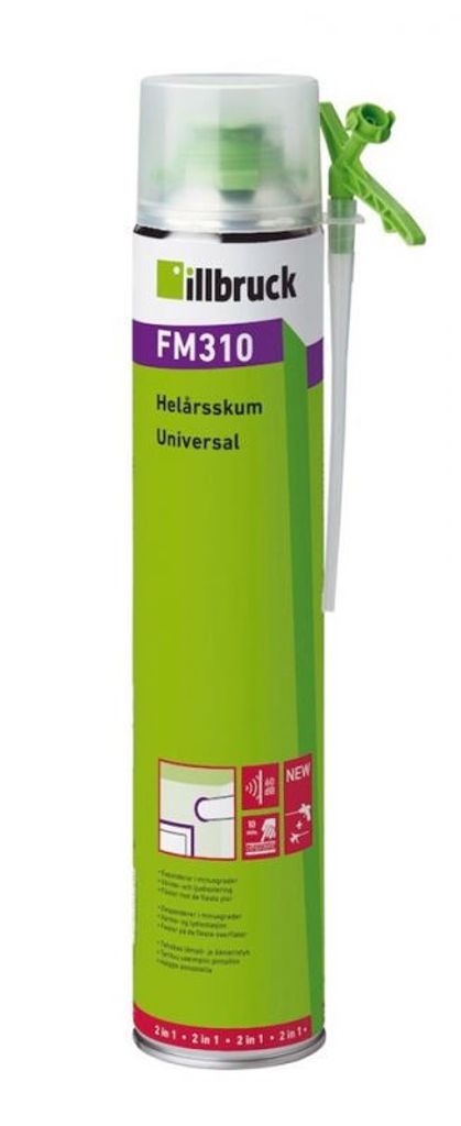Fogskum FM310 helår 2-i-1 illbruck, 1-komponent snabbhärdande polyuretanskum för helårsbruk. Skummet levereras med illbrucks ”2 i 1” ventil där flaskan kan användas för hand eller med pistol.