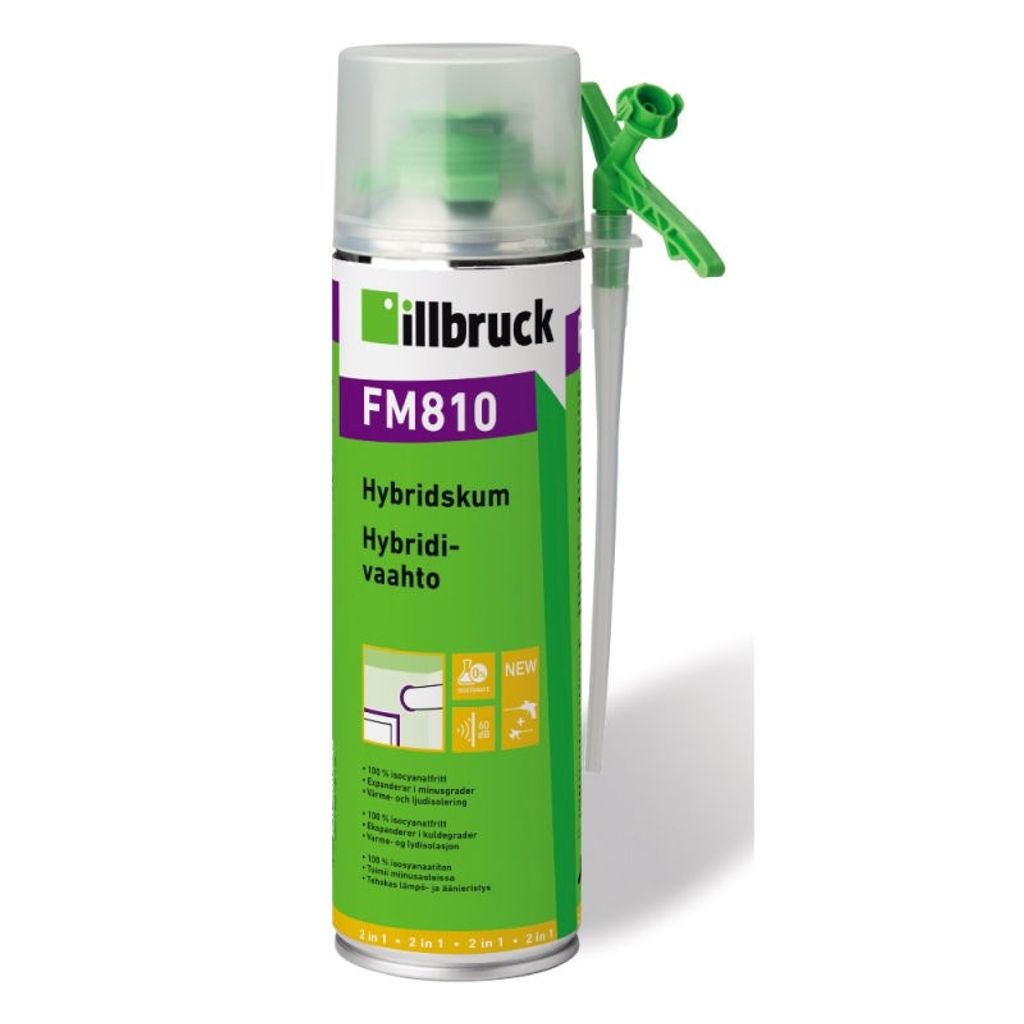 Fogskum FM810 Hybrid 2-i-1 illbruck, 1-komponent silanterminerat hybridskum 100 % fritt från isocyanater. Skummet levereras med illbrucks 2 i 1 ventil där flaskan kan användas för hand eller med pistol.