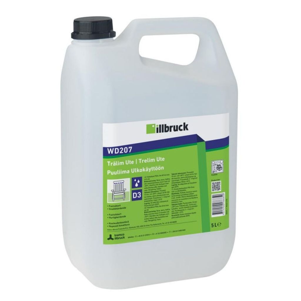 Tremco Trälim WD207 Ute är ett kraftfullt PVAc-lim anpassat för utomhusanvändning. Det är fukttåligt och snabbhärdande, och ger en klar limfog med utmärkt vidhäftning. Limmet är kallvattenbeständigt och ej brandfarligt, vilket gör det säkert att använda i alla miljöer. Det uppfyller kraven i klass D3 EN 204/205. Detta lim är perfekt för limningar som kan bli utsatta för fuktpåverkan, som fönster, ytterdörrar, väggelement, utemöbler och parkettgolv.