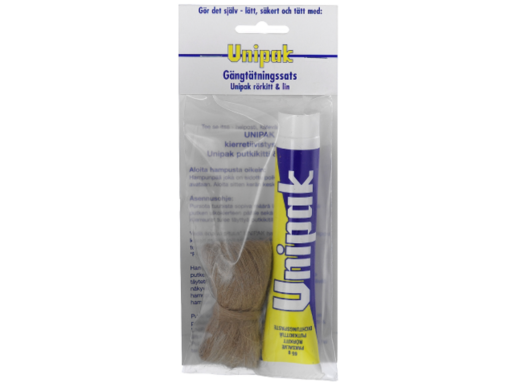 Unipak rörkitt används tillsammans med lin för tätning av gängförbindningar i installationer för bruksvatten, värme och hetvatten. Underlättar monteringsarbetet, ger täta förbindningar och gör ev. senare åtskiljande enklare.