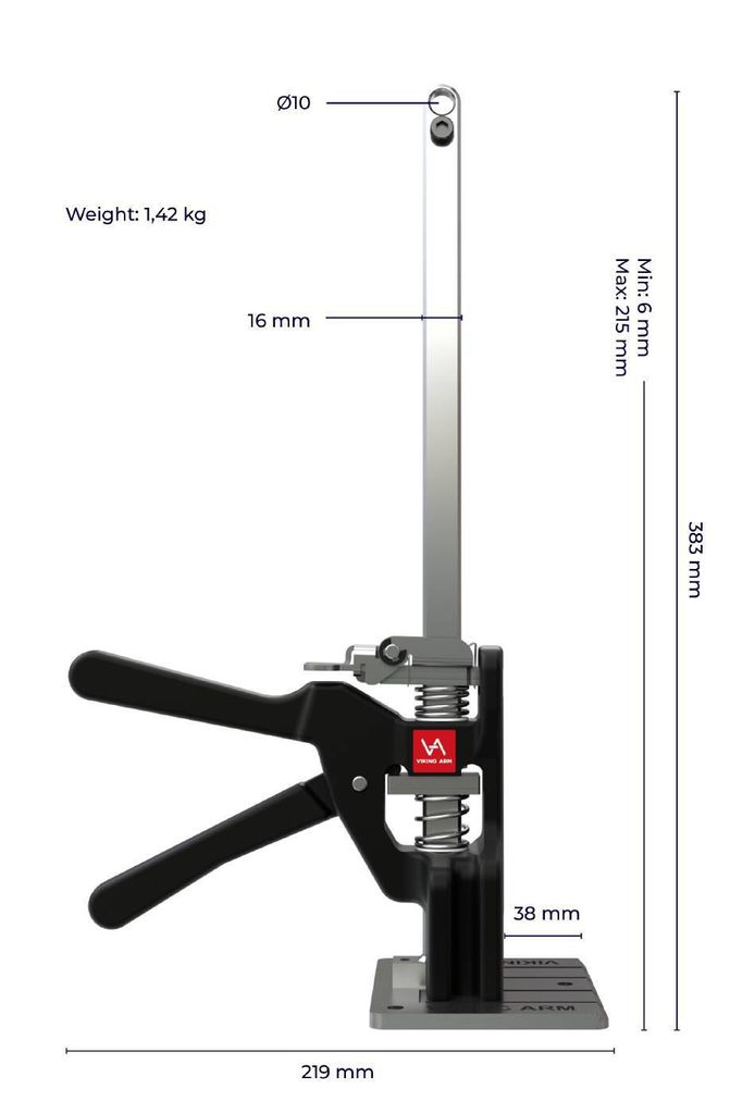 Viking Arm The Original Anniversary Black Edition är en Limited Edition-utgåva av det patenterade lyft- och spännverktyget, designat för precisionslyft och montering. Med en lyftkapacitet på 150 kg och en lyfthöjd på 215 mm, är detta det ultimata verktyget för dörrar, fönster, skåp, vitvaror, reglar, balkar, golv och väggar. Den svarta anodiserade lyft- och bottenplattan, tillsammans med den gummerade basplattan och lyftplattan, gör detta till en exklusiv och stilren version av originalet.