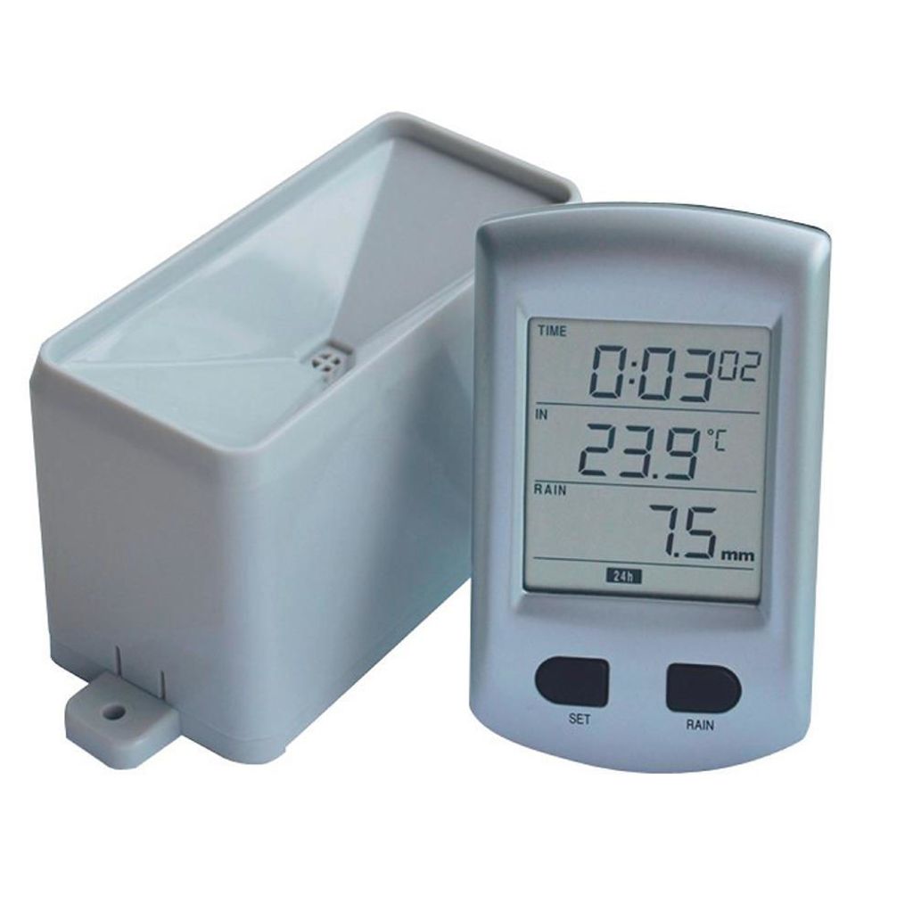 Trådlös med innetemperatur och radiostyrd klocka, tidzoninställning. Kalender, detaljerad visning av regnmängd senaste timmen, dygnet, veckan eller sedan senaste nollställningen. Trådlös överföring av regnmängd från regnsensor till monitor (433 MHz) fjärrfrekvens upp till 100 m (öppet fält). Regnmonitor för väggmontering eller bordsplacering.