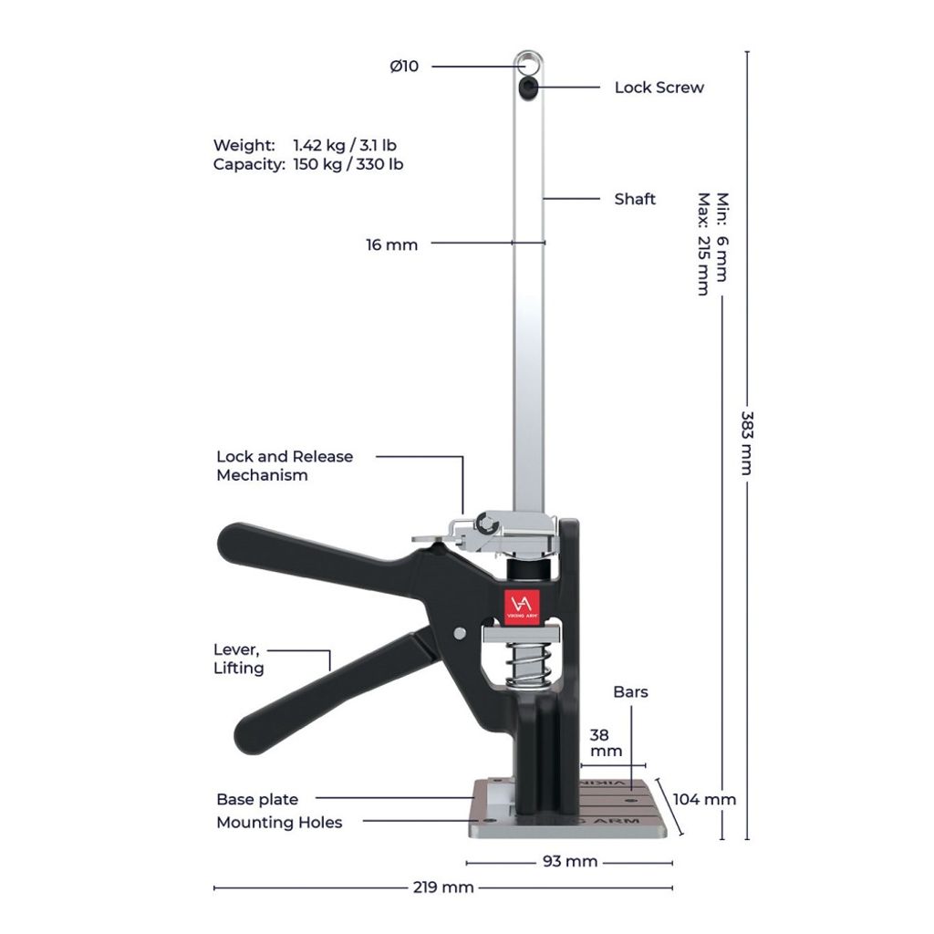 Viking Arm Original är ett patenterat handverktyg som lyfter, håller och nivellerar upp till 150 kg med millimeterprecision. Kompakt, kraftfull och lätt att använda sparar det både tid och kroppskrafter. Perfekt som din tredje hand vid montage av dörrar, fönster, skåp, panel, golv, trall och mycket mer.
