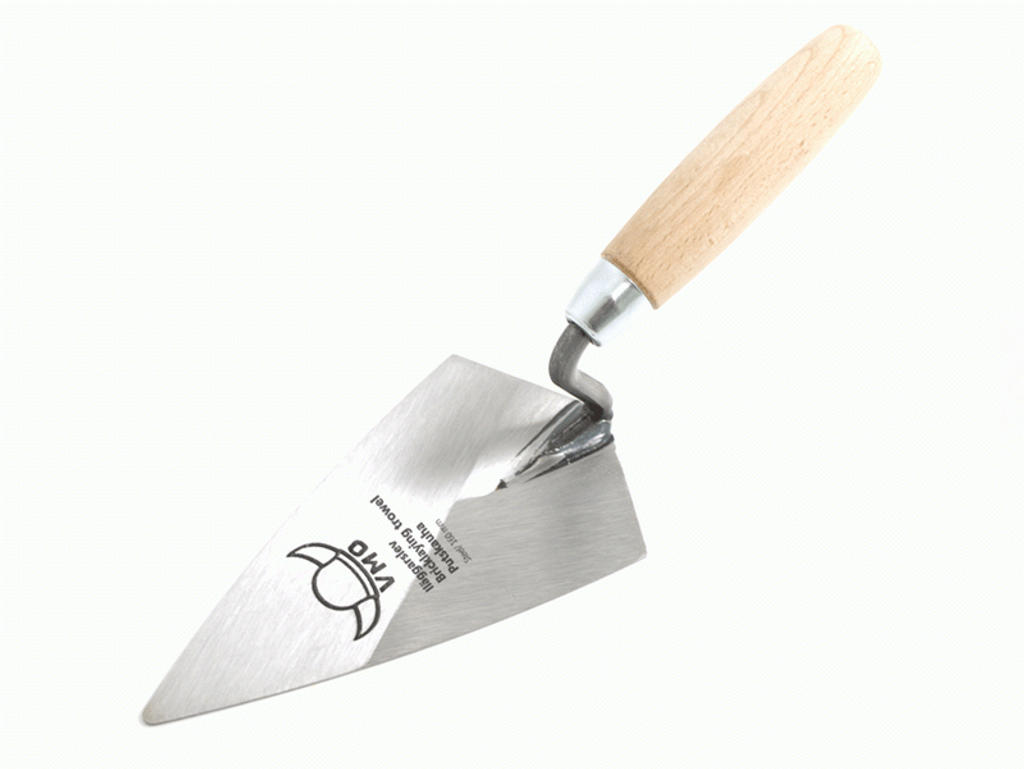 Trähandtag med blad i stål med rundade kanter.