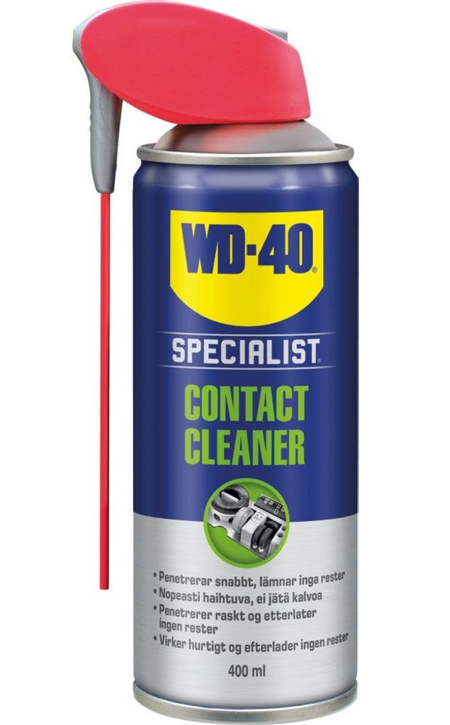 WD-40 Contact Cleaner är ett effektivt rengöringsmedel för elektronik och elektrisk utrustning. Det avlägsnar olja, smuts och flussmedelsrester snabbt och säkert, även i svåråtkomliga utrymmen. Med sin snabbverkande, icke ledande formula torkar det utan att lämna rester. Lämplig för användning på elektrisk utrustning, kontakter, samt plast- och gummiytor. Innehåller 400 ml och är livsmedelsgodkänd enligt NSF H2#145372#.