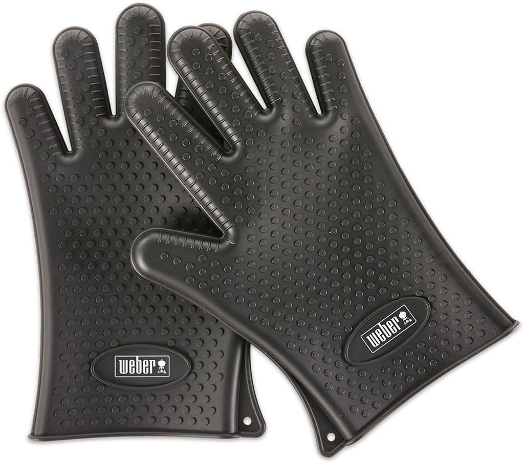 Webers grillhandskar av silikon för arbete vid grillen. Silikonhandskarna är tåliga och gör så att du enkelt flyttar större köttbigar ifrån varma ytor. Du rengör silikonhandskarna för hand med två och vatten.