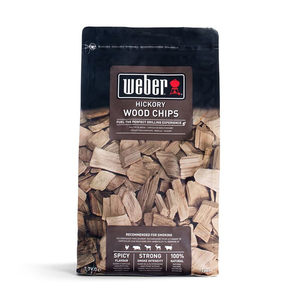 Weber rökflis/chips av hickory. Rökflisen levereras i en praktiskt återförslutningsbar påse. Hickoryträ ger dig en kraftig och skarp baconaktiv röksmak. ickory Rökflis passar utmärkt till rökning av bland annat nötkött, fläskkött och vilt.