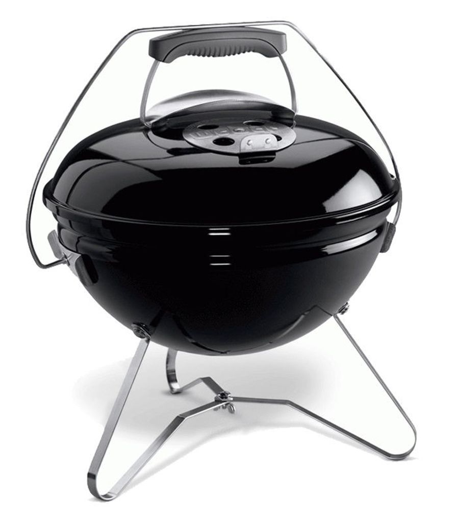 Webers Smokey Joe är en kompakt, bärbar brikettgrill med porslinsemaljerat lock och balja. Den har en invändig värmesköld, lås på locket och ett glasfiberförstärkt termoplasthandtag. Perfekt för grillning på utflykter.