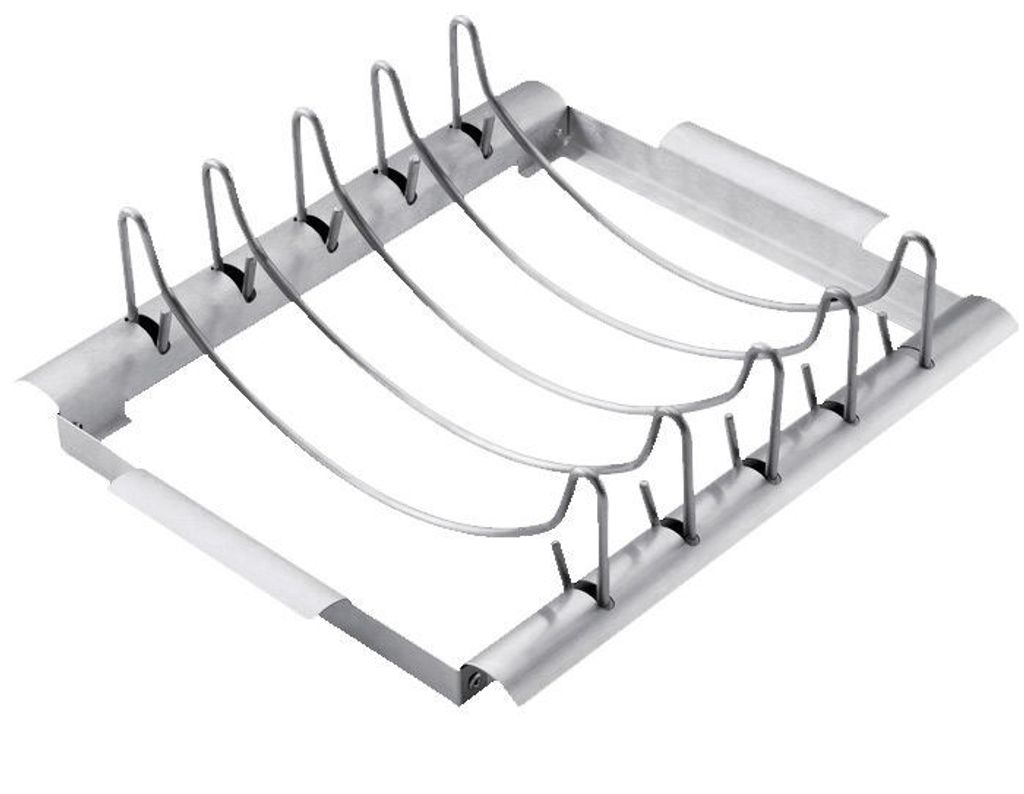 En läcker stek, kryddade revbensspjäll, saftig kyckling eller kanske några spröda toast. Den kombinerade hållaren för revbensspjäll och stek i Weber Style™-serien kan allt. De fem rostfria stålbyglarna är enkla att ta loss och vända efter behov, så att du antingen kan ställa revbensspjäll mellan dem eller lägga en stek i hållaren. Oavsett hur du använder den praktiska hållaren får du fördelarna med att grilla med indirekt värme: Hållaren lyfter upp maten något över grillgallret, så att luften kan cirkulera runt om. Resultatet är ett betydligt saftigare kött, och du undviker dessutom att bränna maten. I stället kan du luta dig tillbaka och ta det lugnt medan grillen gör jobbet åt dig.