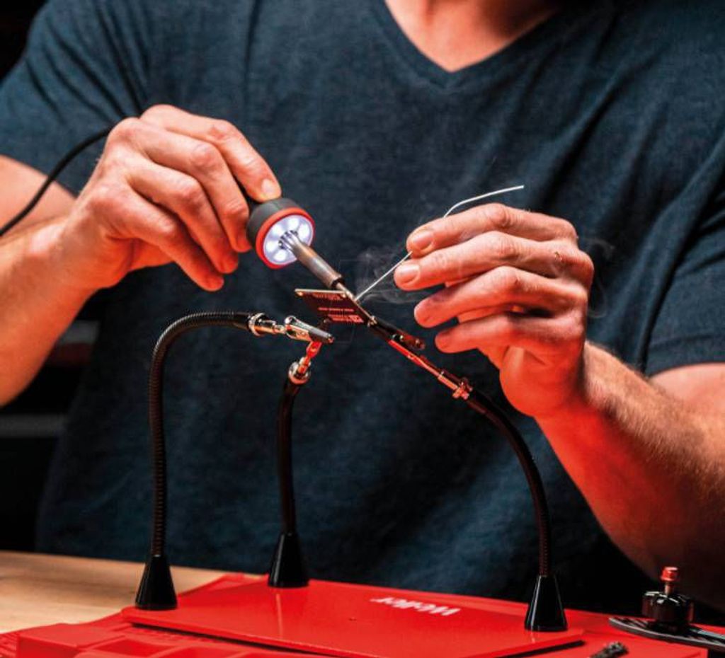 Weller 30 W lödkolv med LED-belysning är en pålitlig och precisionsinriktad lödstation för både professionella och hobbyanvändare. Med 360-graders LED-belysning runt spetsen ger lödkolven optimal sikt och precision vid lödningsarbeten, även i dåligt belysta miljöer. Det ergonomiska handtaget med pennfattning ger en bekväm och stabil greppkänsla för långvarig användning utan trötthet. Lödkolven når en maximal temperatur på 400 °C, vilket gör den idealisk för olika typer av lödningsprojekt. Inkluderar säkerhetsställ och förvaring för spetsar för smidig användning och förvaring.