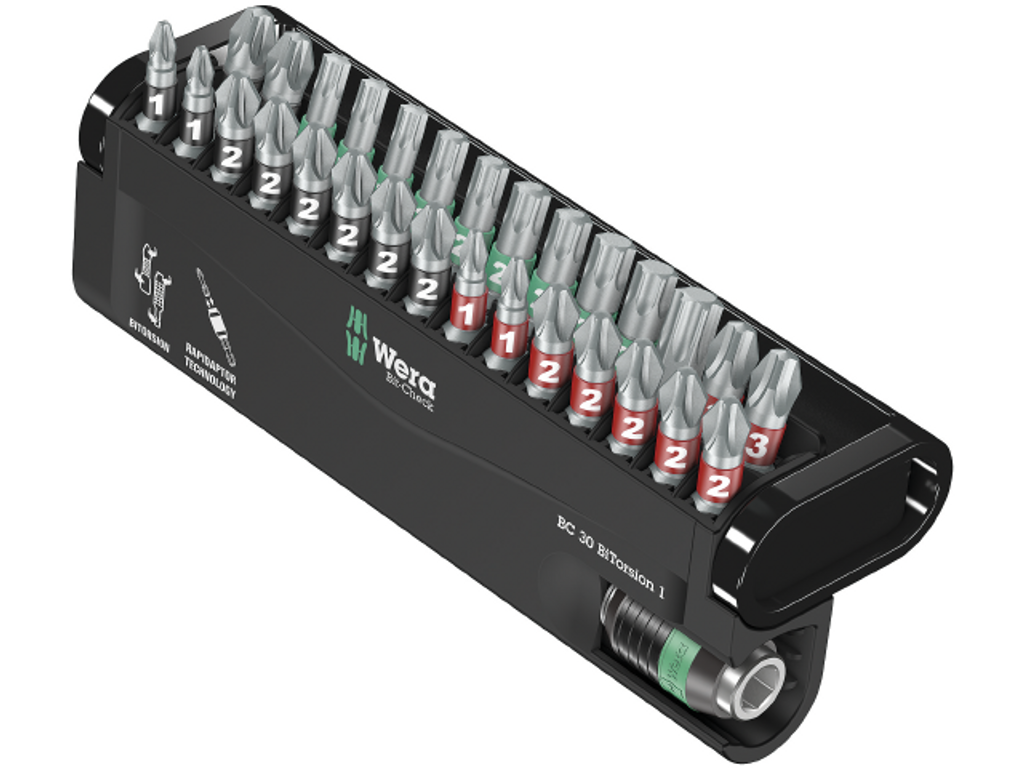 Wera Bit-Check BC-30. Bitssats med 30 delar. Innehåller Rapidaptor bitshållare med snabbchuck samt 29 BiTorsion bits. Bitsen är tydligt uppmärkta med storlek på midjan enligt Wera:s system Tool Finder. Praktisk plastkassett som du enkelt öpnnar med enhandsgrepp.