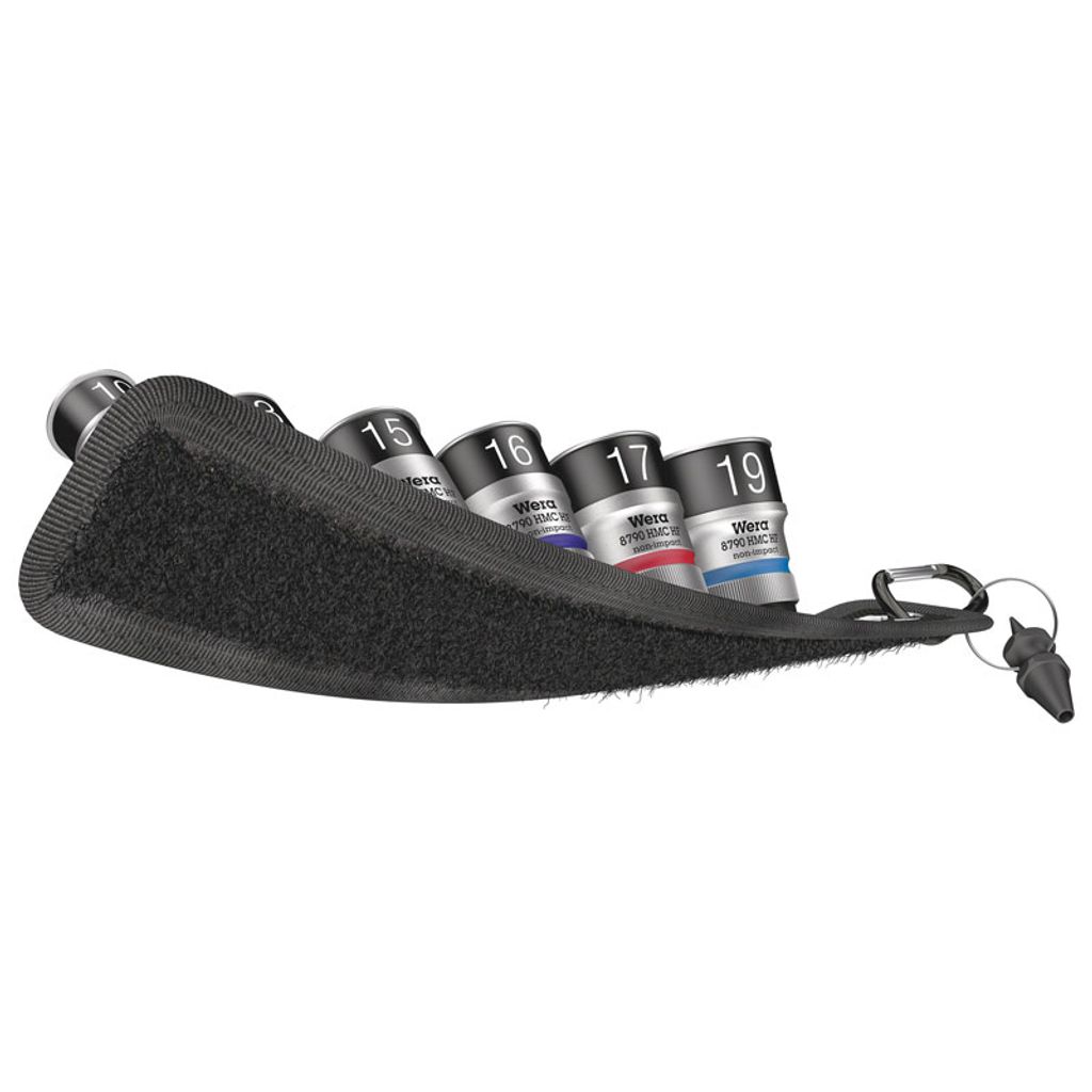 Bygg din mest kompakta och snabba hylslösning med Wera Belt C 1 Zyklop. Det robusta textilbältet rymmer sex hylsor med 1/2 tum fattning och ett mutterurtagningsverktyg på minimalt utrymme. En smidig vridmekanism håller hylsorna säkert på plats, dämpar skrammel och gör dem samtidigt enkla att plocka ut när tempot är högt. Med karbinhake och kardborreband kan bältet fästas i bälte, ficka, vägg, hylla, verkstadsvagn eller Wera 2go.