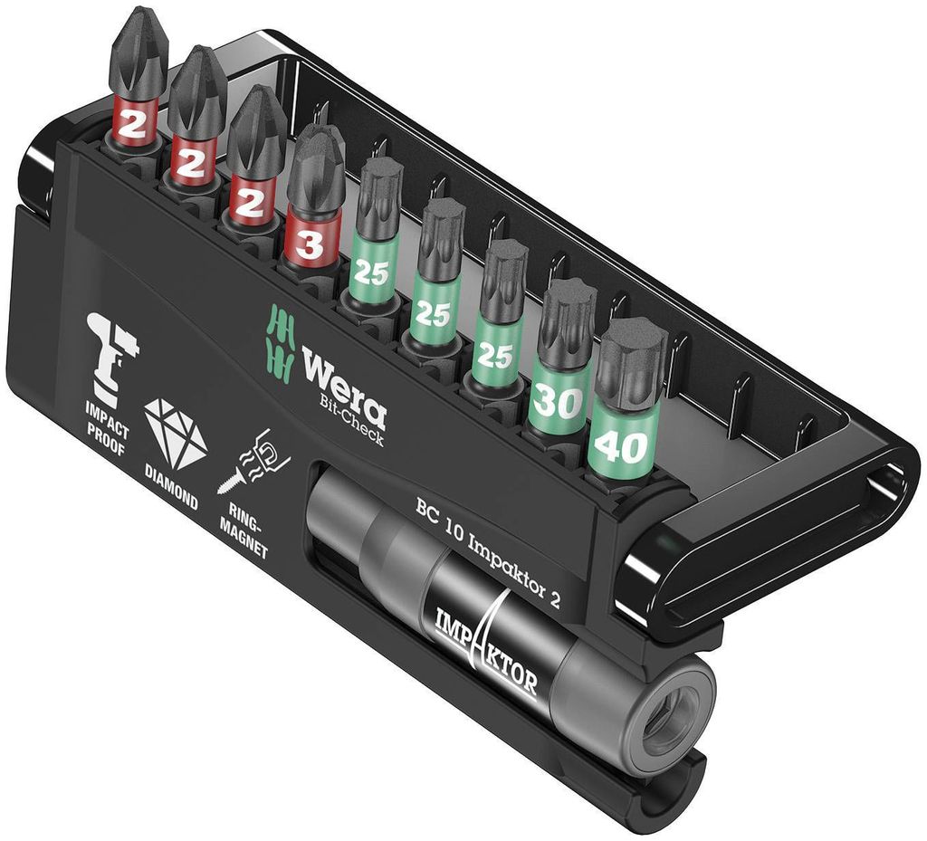 Wera Bit-Checks Impaktor. Bitssats innehållande bitshållare 897/4 IMP R samt 9 olika Impaktor-bits för Phillip och Pozidriv kryss-spår samt Torx-spår.
