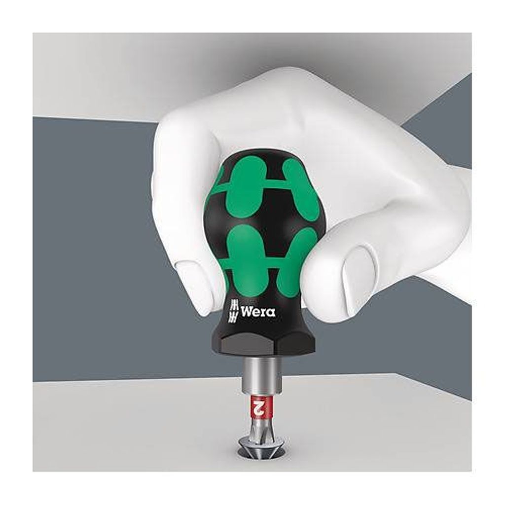 Wera extra liten Stubby-bitsskruvmejsel med kort klinga för svåråtkomliga skruvar. För bits med 1/4"-sexkantsfäste enligt DIN ISO 1173-C 6.3 och Wera-fäste serie 1.