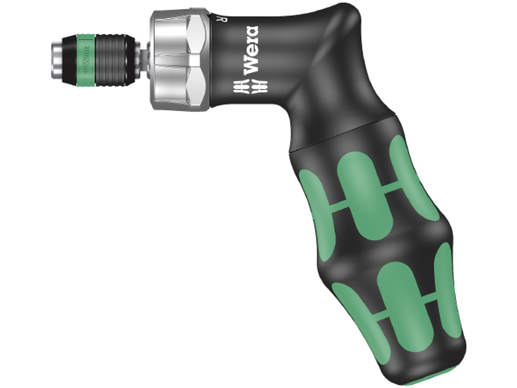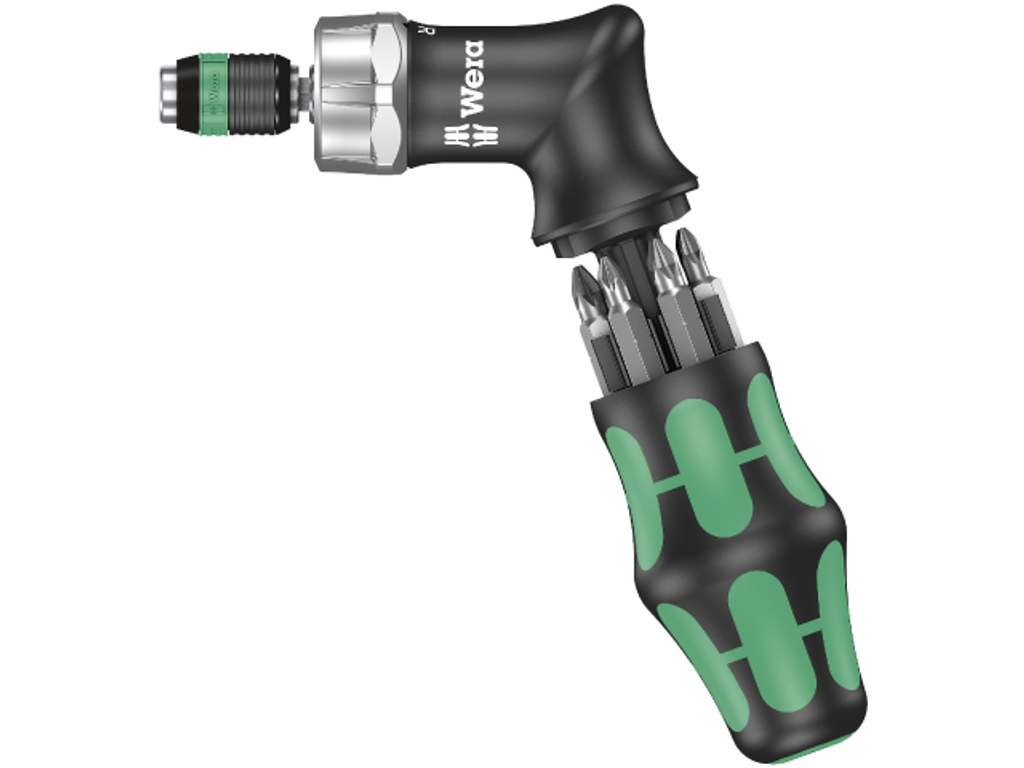 Wera Kraftform Kompakt Pistol RA. Bitsskruvmejsel i pistolform - med ett enkelt tryck på handtagsändan öppnas mejseln och magasinet med 6 bits blir åtkomligt.