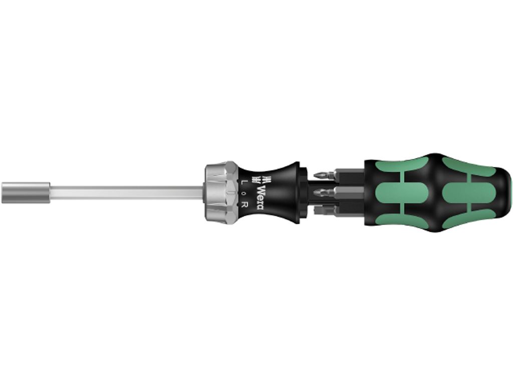 Wera Kraftform Kompakt 27 RA. Med ett enkelt tryck på handtagsändan öppnas mejseln och magasinet med 6 bits blir åtkomligt. Klinga med kraftig magnet som håller både bits och skruv.