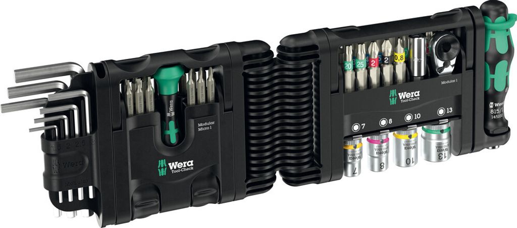 Wera Tool-Check Modular sats 1 är en professionell och ultrakompakt 50-delars verktygssats som kombinerar tre modulära Tool-Check-enheter: Tool-Check Modular 1, Tool-Check Modular Micro 1 och L-nyckelsatsen Hex-Plus 1. Den innehåller bitshandtag, spärrskaft, hylsor, L-nycklar och ett brett sortiment av precisionsbits för insex, spår, Phillips, Pozidriv och TORX®. Medföljande adapter och gångjärn gör det möjligt att bygga ett flexibelt och personligt verktygssystem – idealiskt för proffs som kräver maximal funktion i minimalt format.