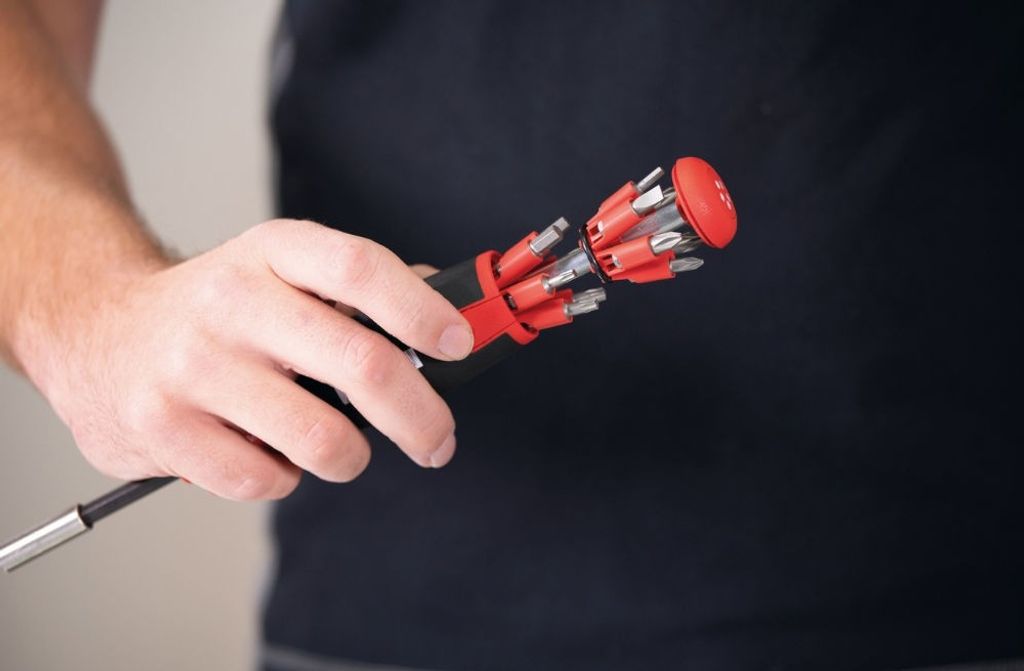- Ersätter en hel skruvmejselsats, vilket sparar plats och tid