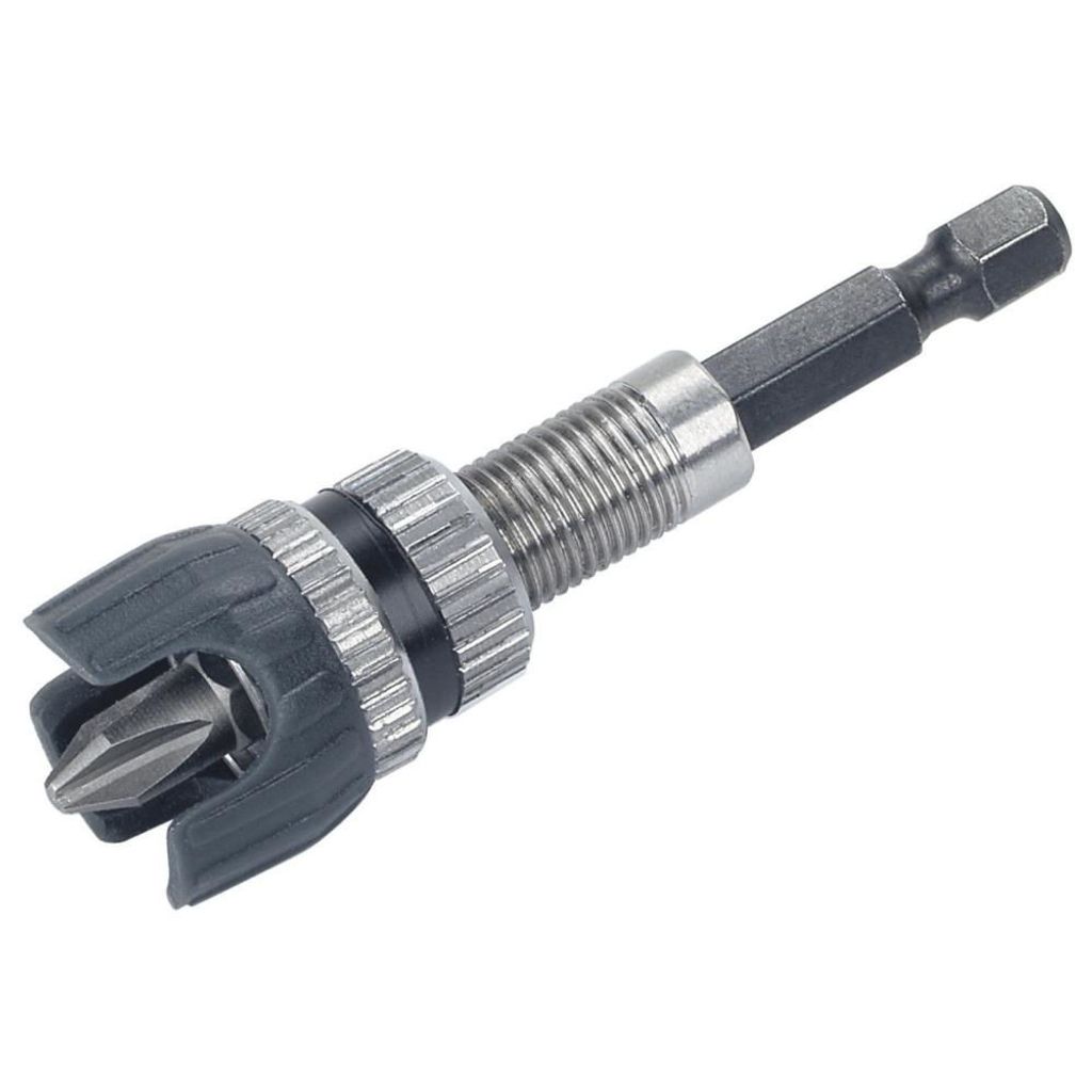 Bithållare med djupanslag för inomhusbruk. Perfekt för att inte dra skruven igenom gipsskivan, t e.x. Plasthuva med "sikte" på bits och skruv.