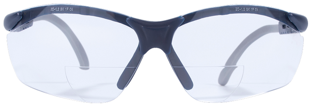 Skydds- och läsglasögon bifocal styrka. Klar lins av polykarbonat. Ställbara skalmar i en blandning av hård och mjuk plast.